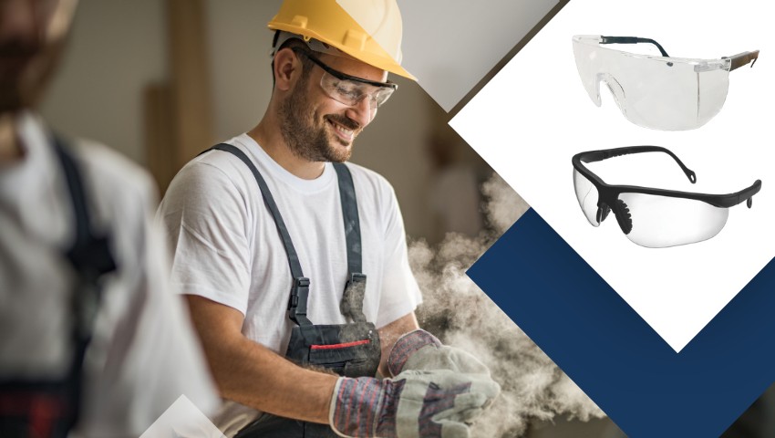 A hard hat is a key safety item. It protects the head from falling objects. A small tool falling from a great height can cause a fatal injury. These special hard hats are designed to absorb very powerful impacts. They prevent bad head injuries. Safety glasses with side shields protect eyes from flying debris and dust. Dust and sparks fill the air. These things can cause eye damage. All workers must wear this important protection.
